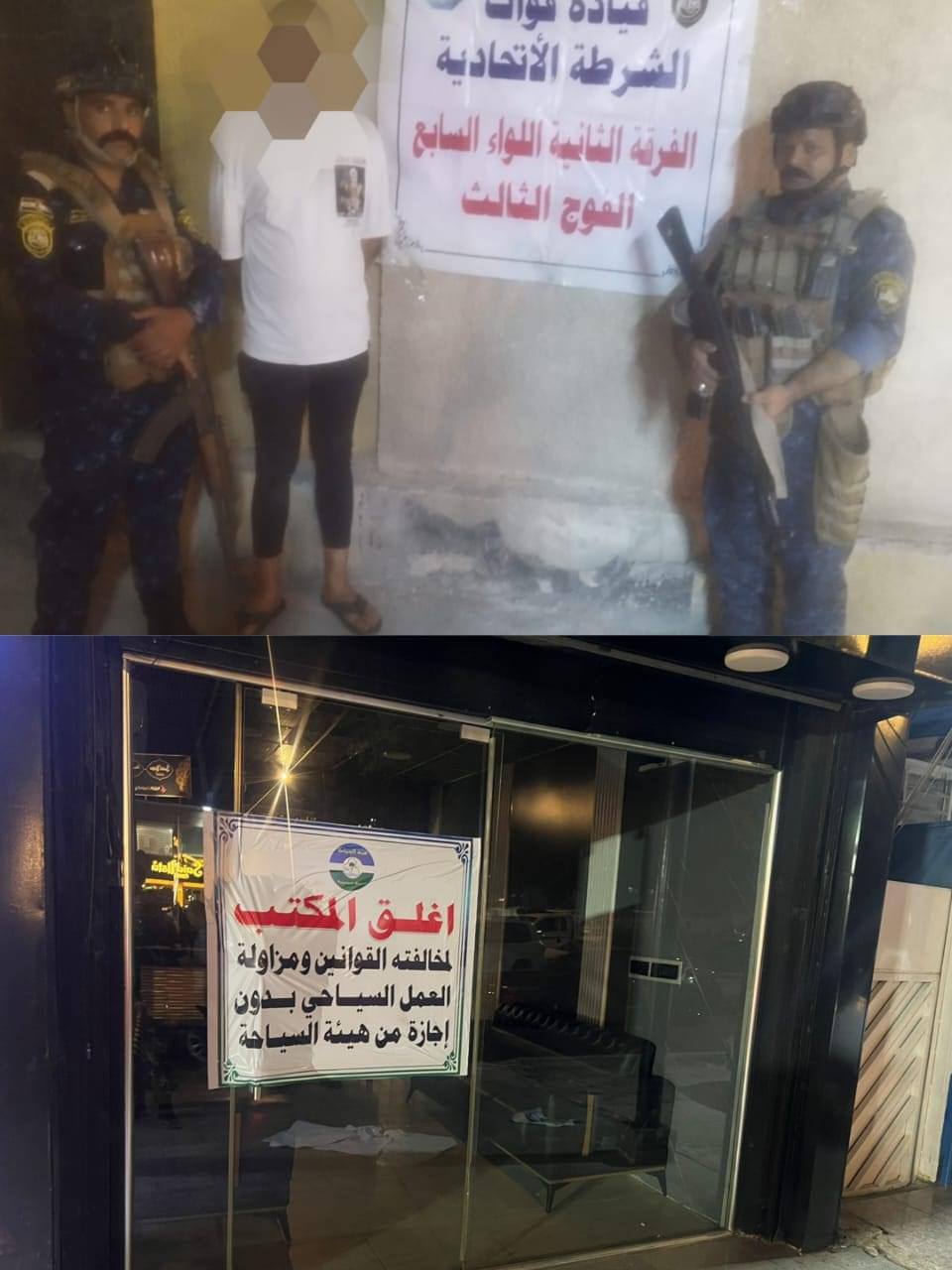 وذكر بيان للقيادة، تلقت “المعالي نيوز” نسخة منه، أنه “تزامناً مع الخطة الأمنية وعمليات البحث والتفتيش المناطقي، تمكنت قطعاتنا الأمنية بالاشتراك مع مفارز من (الأمن/السياحي، جهاز الأمن الوطني، جهاز المخابرات الوطني العراقي، هيئة السياحة)، ومن خلال تنفيذها لعمليات تفتيش وتدقيق مكاتب وشركات السفر والسياحة الغير مجازة، والمخالفة للضوابط والشروط”.