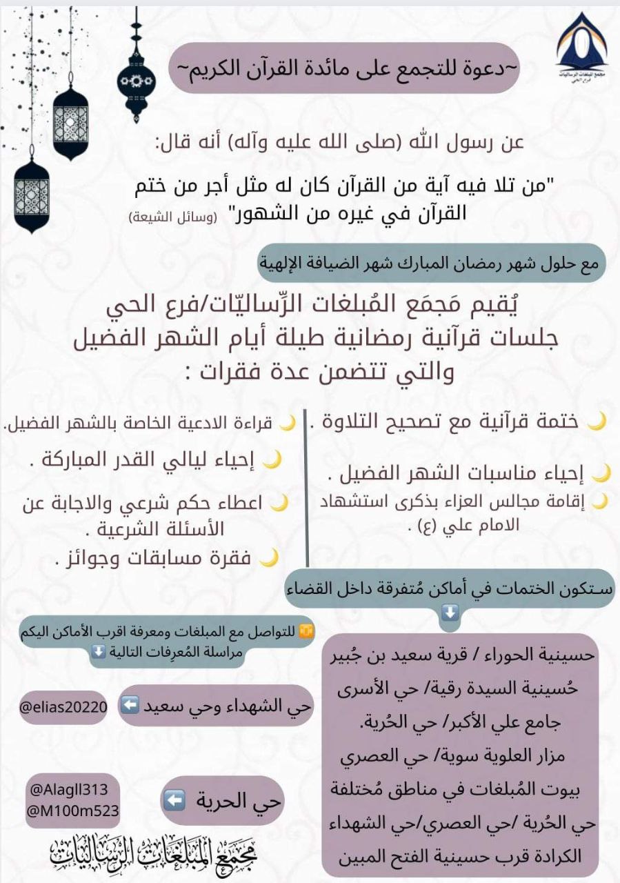 أعلن مجمع المبلغات الرساليات في قضاء الحي، اليوم الأحد، عن إقامة جلساته القرآنية الرمضانية، وذلك طيلة أيام الشهر الفضيل.