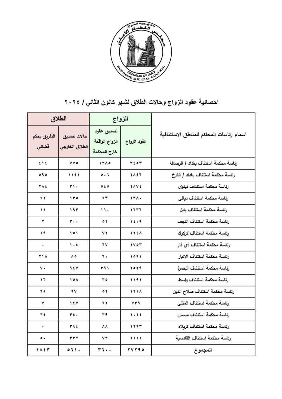 أعلن مجلس القضاء الأعلى، اليوم الاثنين، عن إحصائية عقود الزواج وحالات الطلاق لشهر كانون الثاني 2024.