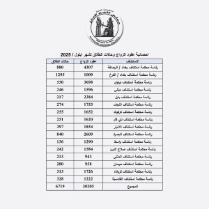 ووفقاً لإحصائية مجلس القضاء، اطلعت عليها “المعالي نيوز”، فإن “العدد الكلي لعقود الزواج، بلغ 30205 عقود، فيما وصل العدد الكلي لحالات الطلاق 6719 حالة، وبلغ عدد عقود الزواج المسجلة في رئاسة محكمة استئناف بغداد/الرصافة، 4307 عقود، تلتها نينوى بـ 3698 عقداً، ثم البصرة بـ 2609 عقود”.