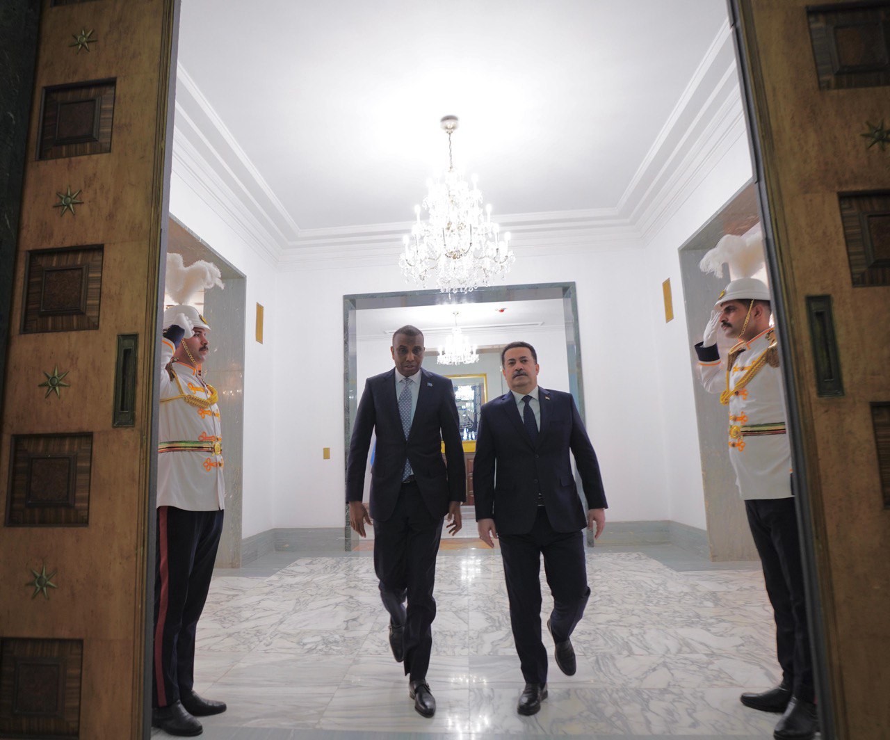 وذكر المكتب الإعلامي لرئيس مجلس الوزراء، في بيان تلقت “المعالي نيوز” نسخة منه، أن “رئيس مجلس الوزراء محمد شياع السوداني، استقبل اليوم، رئيس الوزراء بجمهورية الصومال الفدرالية حمزة عبدي بري، والوفد المرافق له”، مضيفاً “حيث أقام السوداني، مراسم استقبال رسمية لرئيس الوزراء الضيف، في القصر الحكومي بالعاصمة بغداد، تخللها عزف النشيد الوطني لكلا البلدين”.