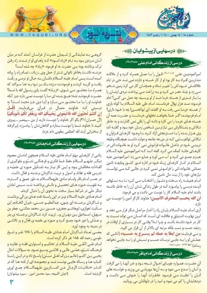 وأشارت المؤسسة، إلى أن “النشرة احتوت بعض من نشاطات مکتب سماحة المرجع الیعقوبي (دام ظله) في قم المقدسة. في الصفحة الثانیة منها”. مبيّنة أنه “في الصفحة الثالثة أشیر إلی دروس من سیرة العملیة لأئمة أهل البیت (ع) تحت عنوان (دروس من القادة). بمناسبة حلول شهر رجب الأصب، وهم الإمام علي أمیر المؤمنین (ع) والإمام محمد الباقر (ع) والإمام علي العادي (ع)”.