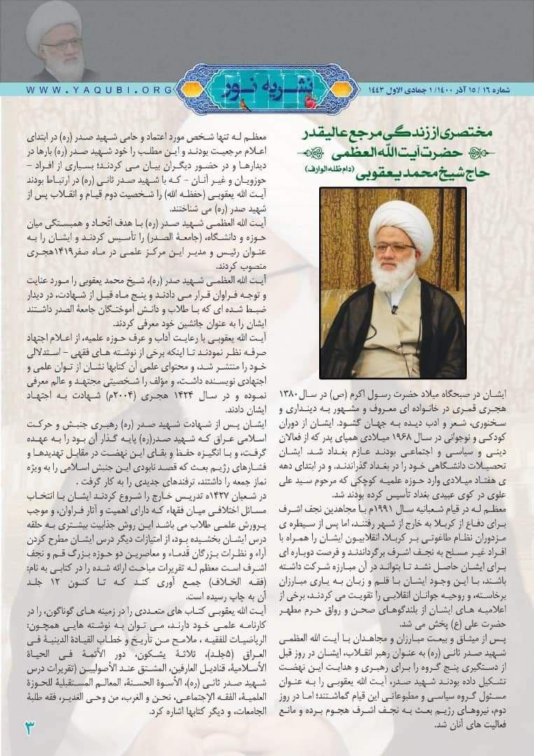 وتابعت المؤسسة، “أیضاً احتوت النشرة بعض من نشاطات مکتب سماحة المرجع الیعقوبي (دام ظله) في قم المقدسة في الصفحة الثانیة منها. وفي الصفحة الثالثة أشیر إلی أهم النقاط من حیاة المرجع الدیني سماحة الشیخ محمد الیعقوبي (دام ظله)”.