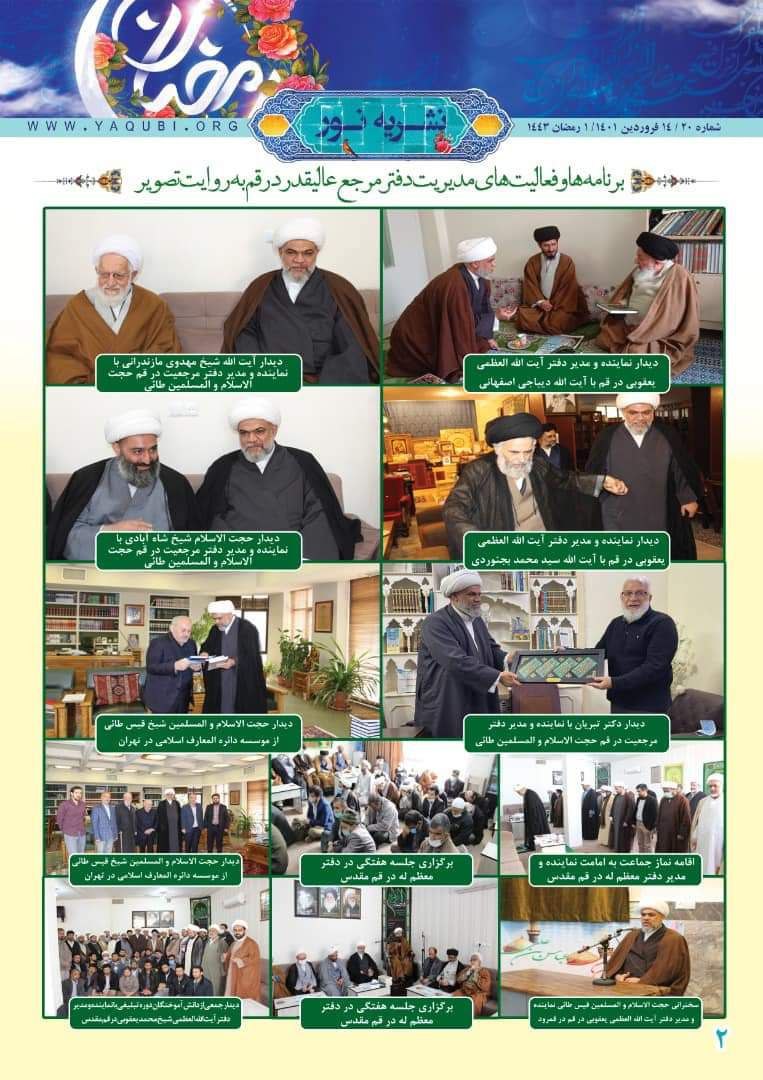 وأضافت، أن “العدد العشرین من النشرة تناول في الصفحة الأولى کلمات لسماحة المرجع الیعقوبي (دام ظله)  بمناسبات متعددة، ذيل عنوان (لیلة القدر في کلام المرجعیة) و(لنحذر الحسرة يوم القيامة). وأیضاً تضم خبر أن المرجع اليعقوبي: يطلق مبادرة الإمام الحسن (ع) فرحة يتيم بمناسبة ذكرى مولد كريم أهل البيت (عليهم السلام) الإمام الحسن المجتبى في ١٥ من شهر رمضان”.
