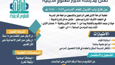 أعلنت مدرسة الأبرار للعلوم الدينية، اليوم الخميس، عن فتح باب القبول للعام الدراسي (1443 – 1444 هـ) لطلبة المرحلة الأولى.…